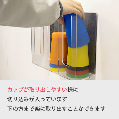 3列に分かれており、メダルや小銭を入れるカップをたくさん収納できます。